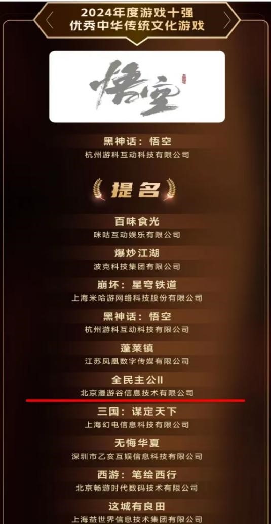????????此次《全民主公II》入圍“2024年度游戲十強優秀中華傳統文化游戲”提名,,,不僅是對一競技/漫游谷在游戲開發和文化傳承方面所做努力的肯定,,,,更是對《全民主公II》在傳播中華傳統文化方面的認可。。。我們將持續努力,,,,致力于為玩家提供更加精彩的游戲體驗。。
